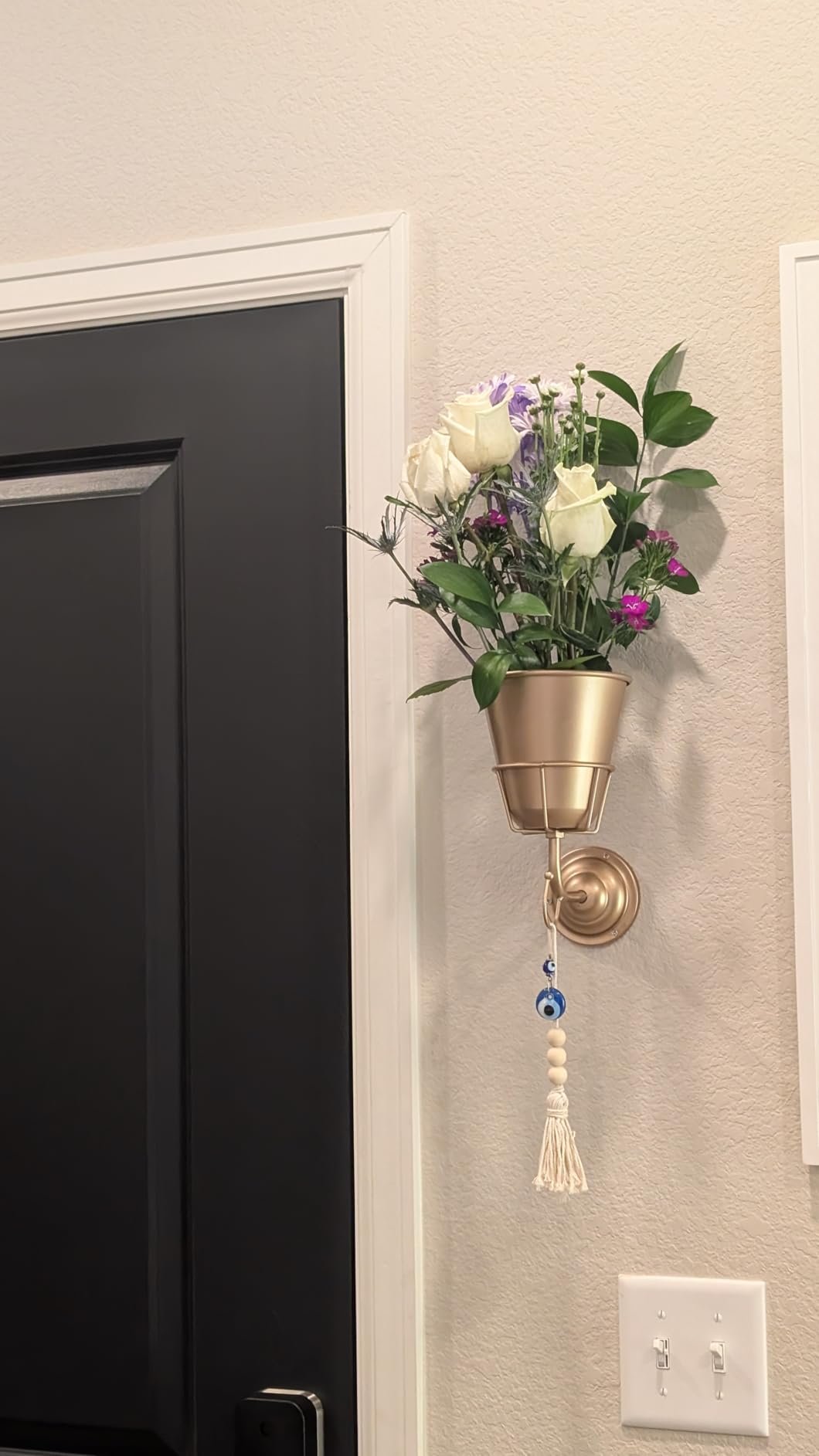 Elegant wall planter designed for both indoor and outdoor spaces. Holds fresh or artificial flowers while offering a handy hook for keys, towels, or small tools. Perfect for kitchens, patios, or entryways.